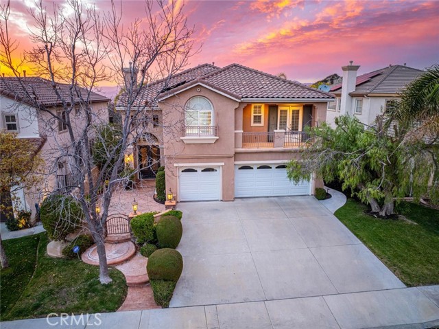 Stevenson Ranch pool home with some of the most TREMENDOUS VIEWS! This popular Twilight Vista home at the top of Stevenson Ranch on a cul de sac boasts over 3,500 sqft with 5 bedrooms and 5 bathrooms. As you enter the formal entry you are greeted with soaring ceilings and a formal living room that includes a fireplace. Design and detail through the adjacent dining room. First floor mini primary suite with ensuite bathroom. Perfect for overnight guests or long term family visitors. The details in the kitchen are not spared with an oversized marble waterfall island, trendy backsplash, white cabinetry, high end appliances including a double Viking oven and fridge. The kitchen spills out to the resort style yard complete with outdoor kitchen, fire pit, pool and spa and endless unobstructed mountain views! The elegant wrought iron staircase takes you upstairs to a loft and 4 bedrooms, including the primary. The primary bedrooms oversized deck is the perfect spot for your morning coffee or early evening sunsets. The primary bathroom has been remodeled with an oversized soaking tub, walk in shower and dual vanities. Not to mention the separate closets. One of the secondary bedrooms upstairs has its own ensuite bathroom that has been remodeled with newer tile and newer quartz countertop. Two additional bedrooms will share the hallway bathroom which has also been upgraded with new counters. The laundry room is located upstairs featuring gray tile floors and new counter tops as well. Close to award winning Stevenson Ranch Elementary, Richard Rioux Park, 5 freeway and shopping! LOW HOA!