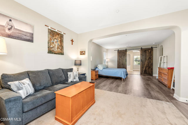 Welcome to this beautiful home in the prestigious Castlewood development, perched high in the scenic foothills of North Central Simi Valley, within the highly sought after Big Sky master planned community! This expansive home boasts 6 bedrooms, 5.5 baths, and an impressive 4,441 square feet of living space, perfectly designed for comfort and luxury. On the main level, you'll find two ensuite bedrooms with full private baths one of which could serve as a second primary suite plus a convenient guest bathroom. The formal living room features soaring ceilings and a cozy fireplace, while the elegant formal dining area offers a perfect setting for entertaining. The heart of the home is the massive family room, complete with a fireplace and ceiling fan, which opens to a gourmet kitchen featuring a 6 seat island, upgraded stainless steel appliances, a breakfast nook, walk in pantry, desk area, and granite countertops and backsplash. Upstairs, the primary suite is a true retreat, offering a spacious sitting area, an enclosed patio currently used as an office, and stunning barn doors leading to a luxurious master bath. The bath includes dual sinks, a jetted soaking tub, a separate shower, and an expansive walk in closet. The second level also features three additional bedrooms one with an ensuite bath and two in a Jack and Jill setup, an upstairs laundry room, and a versatile loft or library area. Recently painted both inside and out, this home is filled with premium touches, including wood like flooring, bullnose baseboards, plantation shutters, 2' blinds on all windows, LED lighting, fire sprinklers, dual paned windows, and epoxy flooring in the 3 car tandem garage, which also houses a brand new water heater. The home is equipped with a leased solar electrical system for energy efficiency. Step outside to your private backyard oasis with a custom paver patio, gazebo, grassy area, and storage shed, all surrounded by beautifully manicured landscaping. The Big Sky community offers a wealth of outdoor amenities, including walking and hiking trails, a dog park, softball fields, and breathtaking mountain views. Conveniently located near shopping, dining, and the 118 Freeway, this home is a commuter's dream. Don't miss this rare opportunity to own in one of Simi Valley's most desirable neighborhoods!